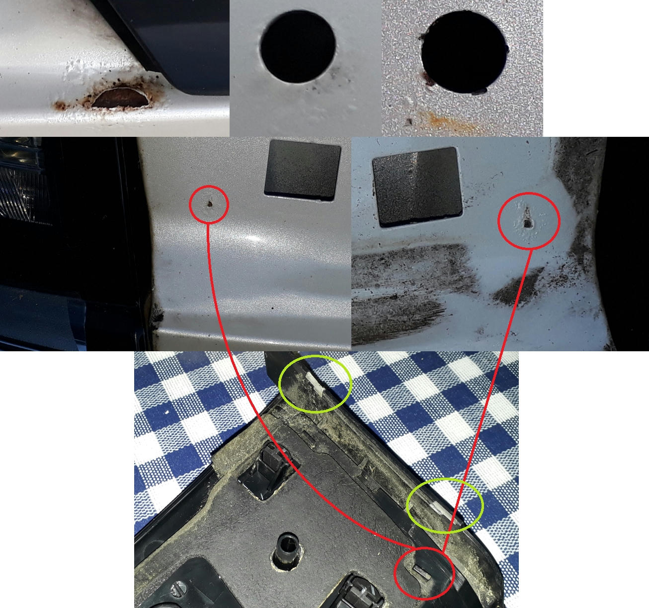 Hier sind Drakas Roststellen auf beiden Seiten unter den Reflektoren. Das letzte Bild ist von meiner Klappe als Vergleich: